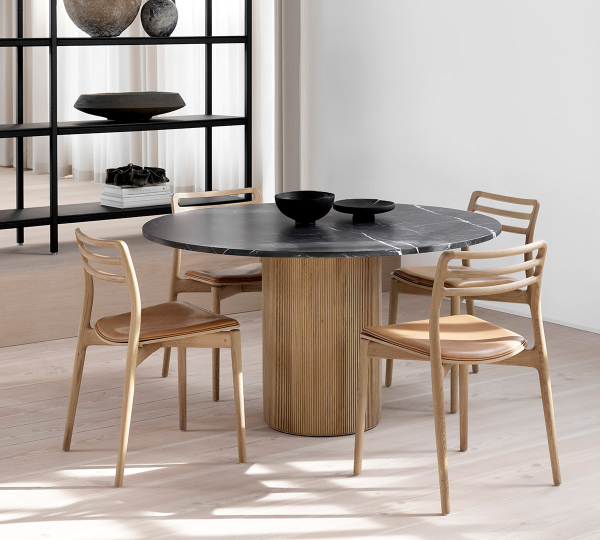 Et rundt spisebord skaber en social og indbydende spisegruppe. Fordelen ved et rundt spisebord er, at alle, der sidder rundt om bordet, kan se hinanden. Her dannes et dejligt fællesskab, hvor alle inviteres ind i samtalen. Et rundt spisebord kan desuden blødgøre og skabe harmoni i et kantet rum. De afrundede former bidrager til et mere organisk formsprog, der føles mere naturligt for øjet. Vær opmærksom på, at et rundt spisebord fylder mere plads i et rum, og jo større diameter du vælger, jo længere bliver afstanden tværs over spisebordet. Til et rundt spisebord regner man normalt med, at en siddeplads kræver cirka 70 centimeter af bordets omkreds.